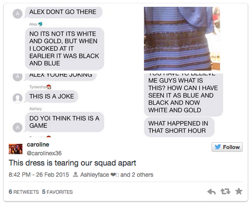 If somehow you missed out on ‘the singularity’, which broke Buzzfeed’s all-time traffic records on the way to becoming one of the most truly bizarre viral explosions in recent memory, here’s a quick rundown. Yesterday, Tumblr user swiked posted a picture of this dress, to be worn by the mother of the bride at a Scottish wedding, along with a simple question: what colour is it?