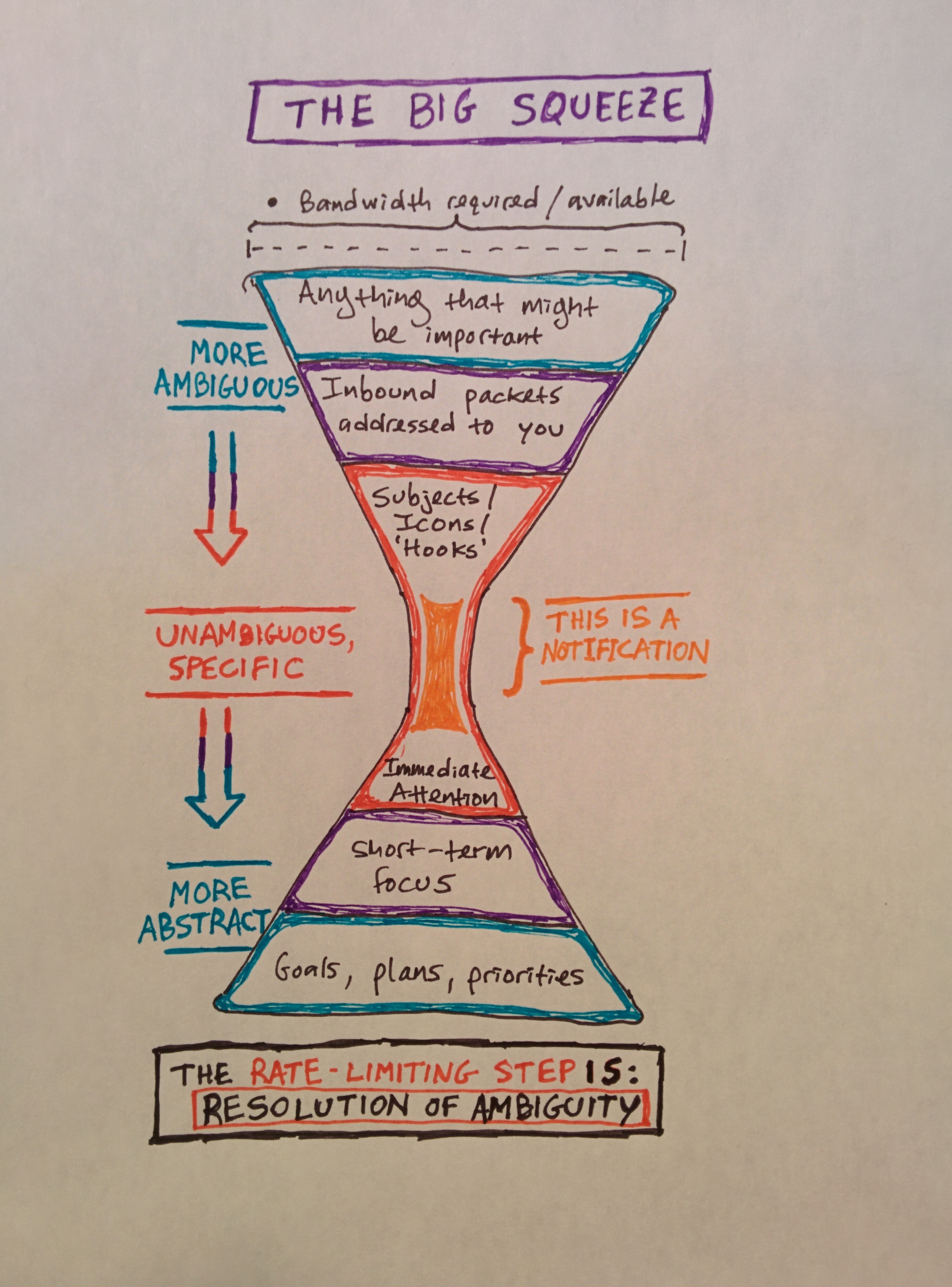 So if ambiguity resolution is the rate-limiting step in our intake of inbound information, then what factors determine that rate? I’d argue there are basically two that matter: 1. The quality and clarity of information presented, and 2. The amount of bandwidth we have available. And right now, we’re struggling to keep up with that intake. So what can be done? We have two options. We can either ‘improve’ notifications in some way – which is what nearly everyone I talked to offered as a solution. Make them smarter, make them more relevant, make them more actionable – sure. But all of these suggestions feel like incremental improvements that are squeezing last drops of efficiency out of an otherwise saturated pipe. So what’s left? The other option – which I believe is actually a much better solution – is that we can go find more bandwidth.