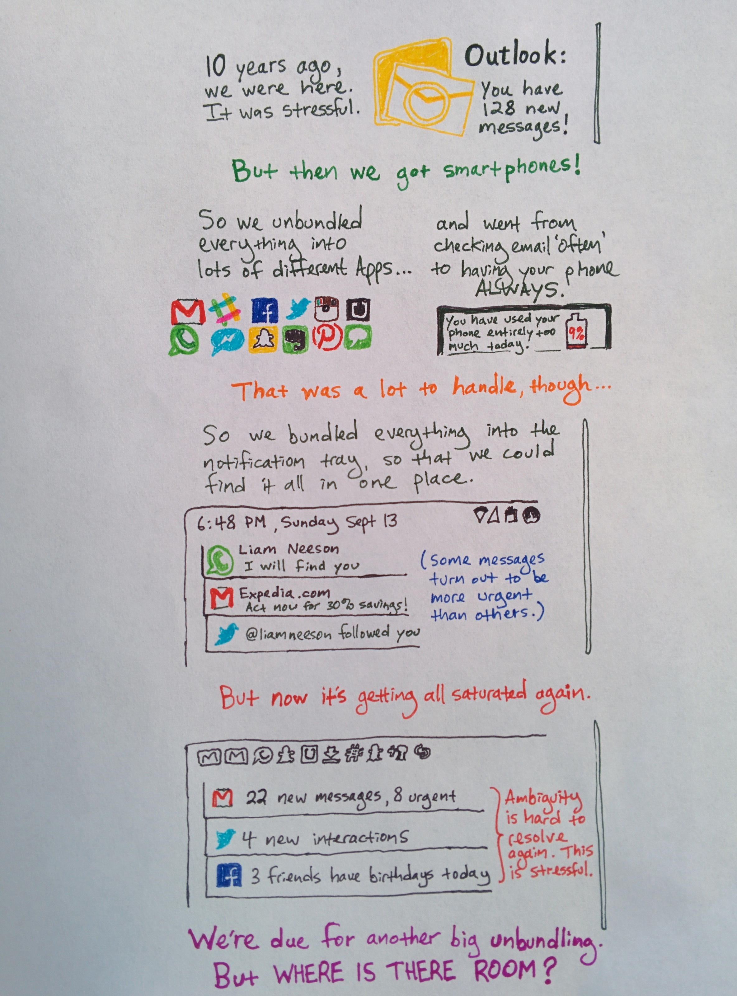 It also would make for a very nice continuation of the bundling-and-unbundling arc that has shaped notifications over the last ten years, and could keep it going for another ten or more. Starting from Outlook (a single channel we checked at discrete times), we unbundled into multiple channels (Apps) that were with us all the time, and widened our ambiguity-resolution bandwidth considerably. But then that got messy, so we bundled all of those channels into one physical place (the notification tray), which was very efficient but ultimately became saturated – we ran out of resolution in the time domain to handle everything at once. I’m willing to bet that the next big unbundling will be an unbundling of the notification tray out into physical space – across our screens, maybe in our watches, who knows wherever else- but in a way that dramatically improves our ambiguity resolution bandwidth.