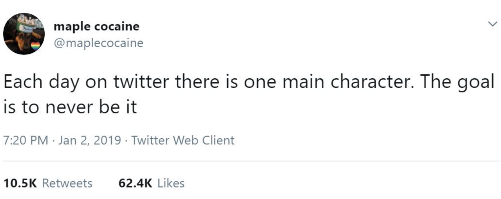 In online games like Fortnite, one thing that happens from time to time is the map changes: the players have to learn the new terrain, figure out where things are, understand the layout of the place, and then go play. Twitter is pretty similar, except instead of a map changing, it’s “every day there’s a new set of topics we’re going to talk about, and a new person we’re going to be mad at.” What Twitter does more effectively than any other forum in history is create new people to roast on a daily basis. This obviously has some bad consequences in real life for things like abuse, bad discourse, and other actual problems; but we’re not going to talk about that right now because this isn’t a Serious Blog Post about Real Serious Issues; it’s a blog about why twitter is funny.