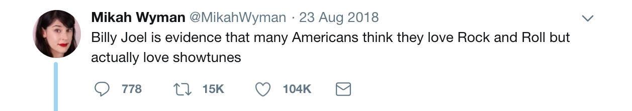 Or, for that matter, think of your favourite Billy Joel tune: is it Piano Man? Uptown Girl? We Didn’t Start the Fire? Only the Good Die Young? All of these songs are like a masterfully scripted wrestling show: they’re not rock songs; they’re precisely engineered to make us feel authentic rock and roll feelings in a predictable, faithful way. They are the lovingly crafted display stand at Starbucks; the formulaic but still exciting Prestige TV we adore; they are America. And we love it.