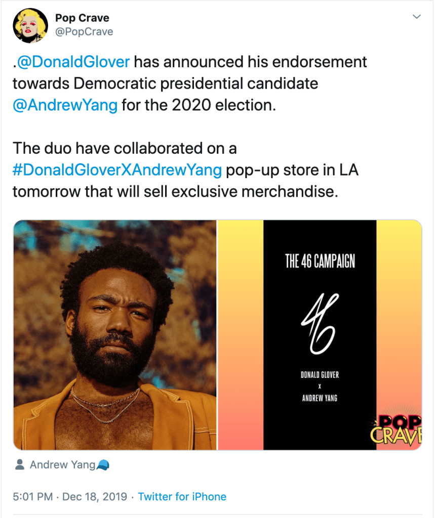 I got to thinking of this the other day when news dropped that Donald Glover was endorsing Andrew Yang for president through … an LA pop-up store collaboration? Like, what is this exactly? It feels like a hack of some kind. It’s clever, for one thing; it got everybody talking about it. And when you think about it, why shouldn’t you leverage a presidential endorsement to sell merch and extend your own brand? What else could you do?