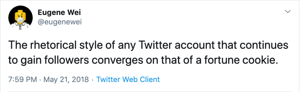 LOL okay I don’t hate those ones as much because they usually offer some great analysis. To continue the analogy, those ones are the equivalent of selling high-quality produce with great marketing and logistics optimization. The fortune cookie tweets are just truly a lower quality vegetable 😂