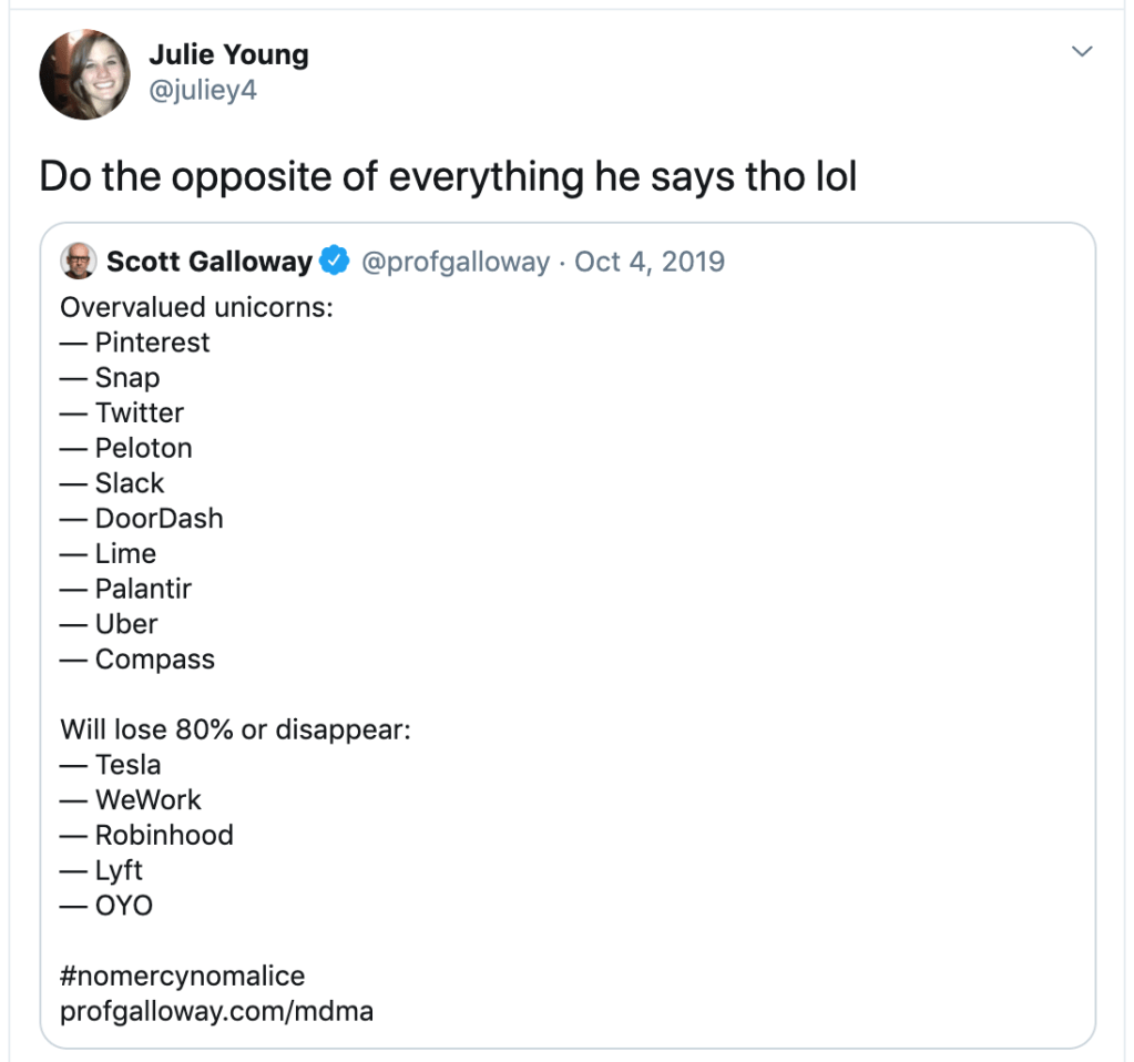 I feel like there is real signal in this – not “Anti-Galloway” per se, although he’s a great contra, but more this feeling like, “There’s a lot to criticize in these tech growth stocks, but that criticism is definitely not it, it’s wrong and it’s predictably wrong, so I’ll buy some of whatever the opposite of that is.” How would you describe the contra here?