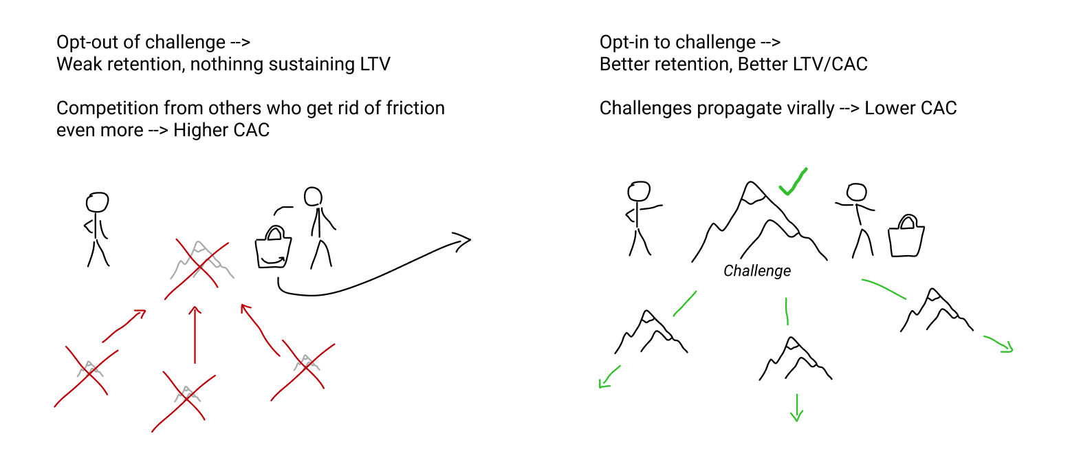 But getting rid of friction is only half of the battle. There’s another aspect of commerce that we need to understand too: challenge. They might seem superficially similar, but they’re not.