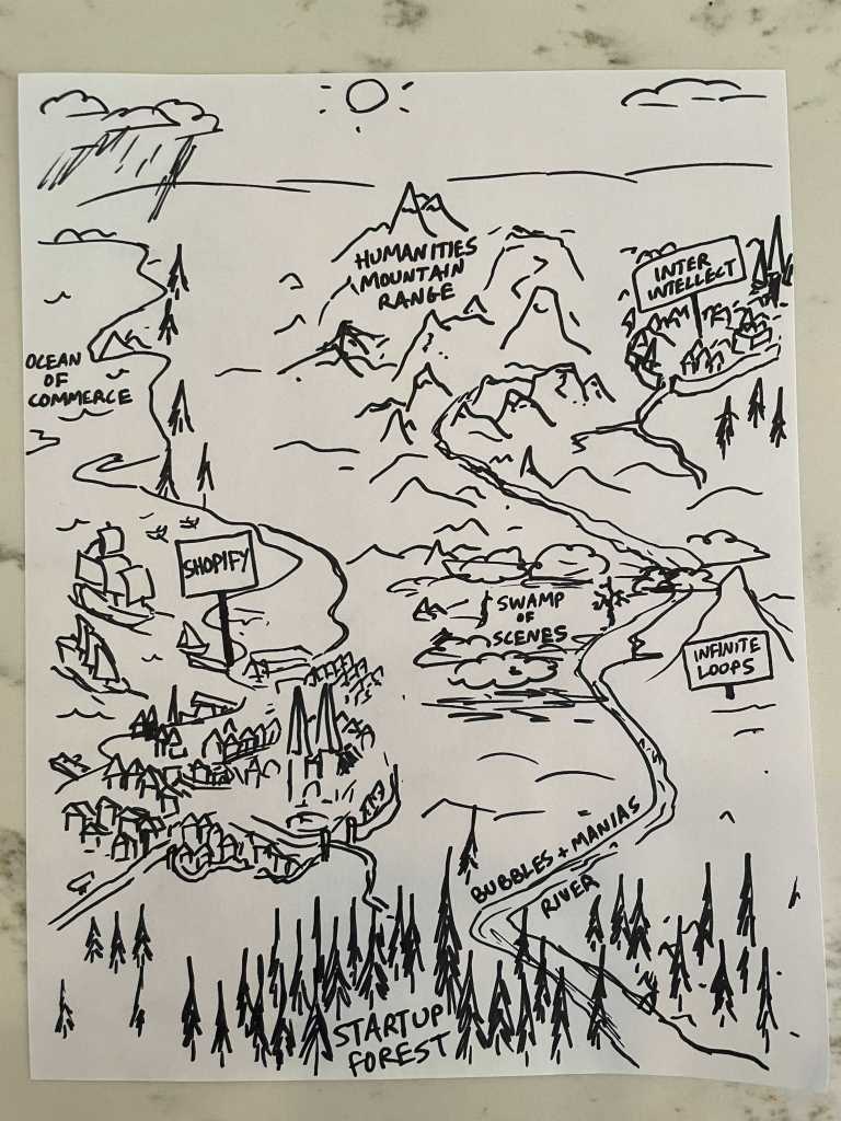 Finally, there’s one more big theme that cuts right through all of the other three: Bubbles and Manias River. This river has its origin in the Humanities Mountain Range: what makes people want things? What makes different people suddenly become alike, and what makes them compete with each other? Then it cuts through the swamp of scenes: how do people spontaneously and stably organize themselves around beliefs and goals, however arbitrary and insular they might be? Further downstream, it flows through and irrigates the Startup Forest: how is Silicon Valley like a controlled bubble?