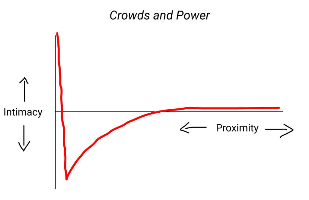 Canetti goes on to describe a powerful phenomenon, which is the release of energy that happens when a group of individuals all of a sudden throw off their differences and defensiveness, and merges into a crowd. Crowds form when the perceived distances between people drop to zero, and intimacy within the group suddenly swings from negative to positive. This can mean a physical crowd – one common place people have viscerally felt this physical “coming together” is at sports games or concerts – but the same thing happens during team formation, when there’s this distinct moment where a group of individuals aware of their differences suddenly transforms into a united crowd that becomes capable and powerful.