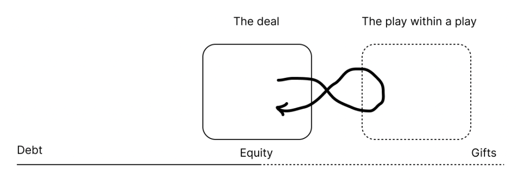 What kind of rights, or claims, does gift capital have? If debt gives the issuer a senior claim on the success of a project, and equity gives you a residual claim, then gifts give you something else: a social claim on the success of a project. That social claim has obvious appeal, and you see it clearly at work in ventures like restaurants, art galleries, show business; where it’s clearly about the social cachet and returns to being able to close a business deal over a meal at your place.