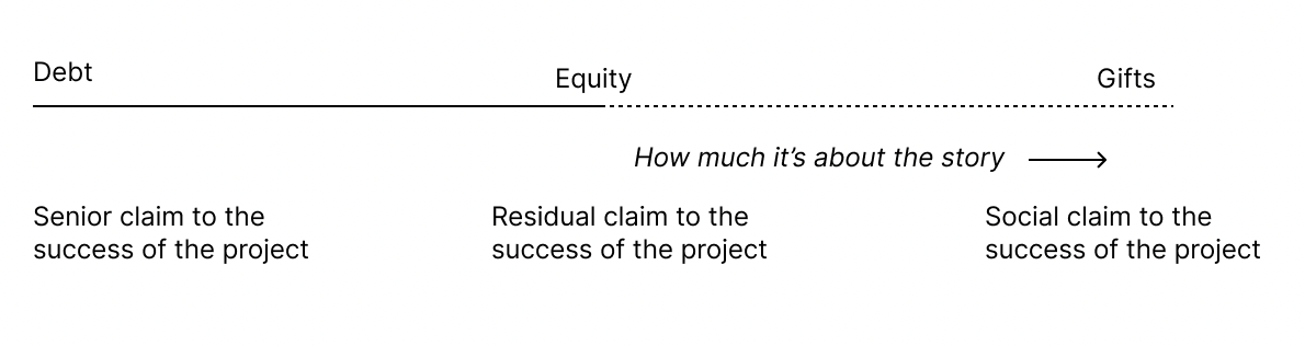 What kind of rights, or claims, does gift capital have? If debt gives the issuer a senior claim on the success of a project, and equity gives you a residual claim, then gifts give you something else: a social claim on the success of a project. That social claim has obvious appeal, and you see it clearly at work in ventures like restaurants, art galleries, show business; where it’s clearly about the social cachet and returns to being able to close a business deal over a meal at your place.