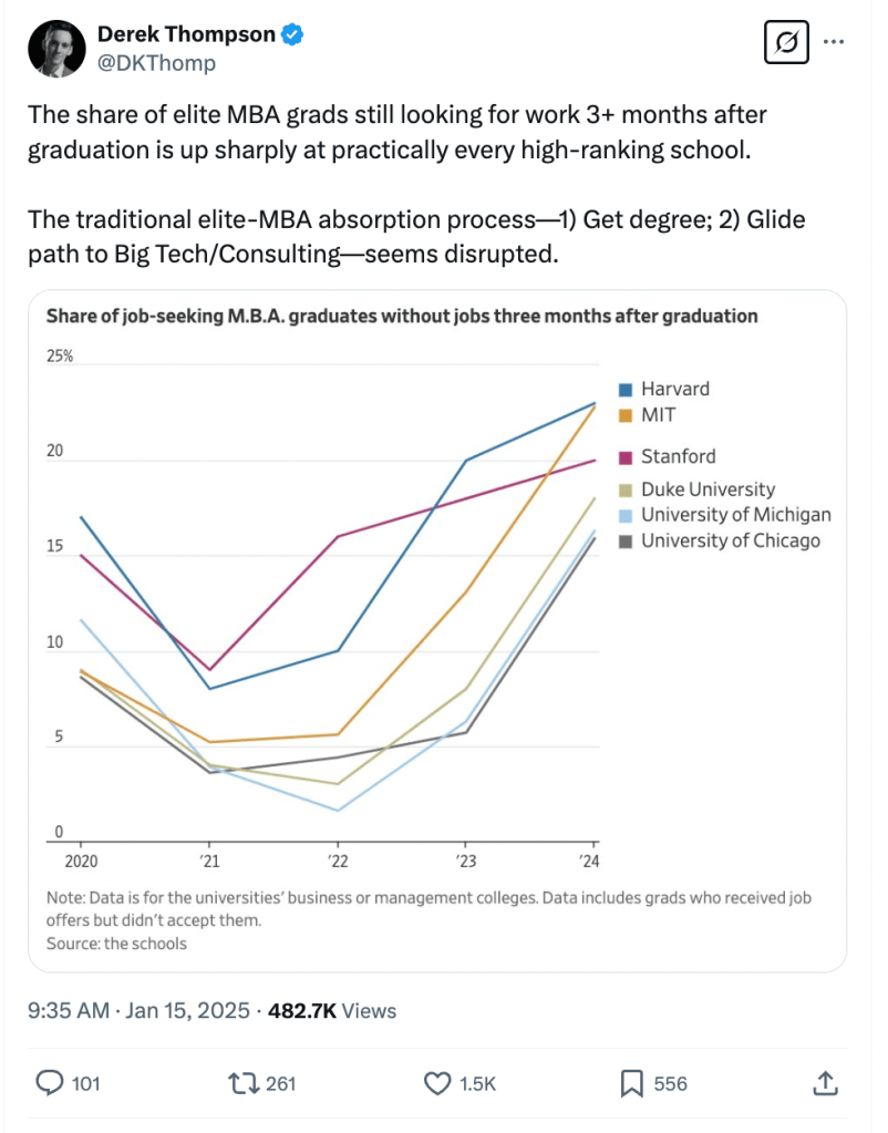 And it does look like the shine is starting to really come off of the MBA-to-consulting pipeline, among other job pathways: