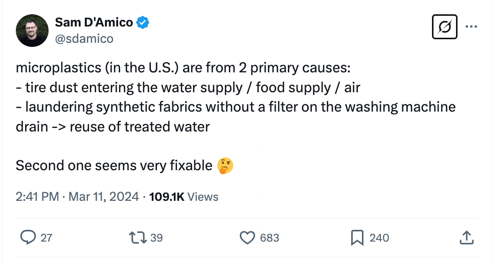 Moreover, I’m also going to claim credit for the prediction that the actual source of most microplastics in food – as far as we understand it – is actually from our clothes. For all our focus on processed food preparation, which is important for lots of reasons, the real source of this stuff is external: