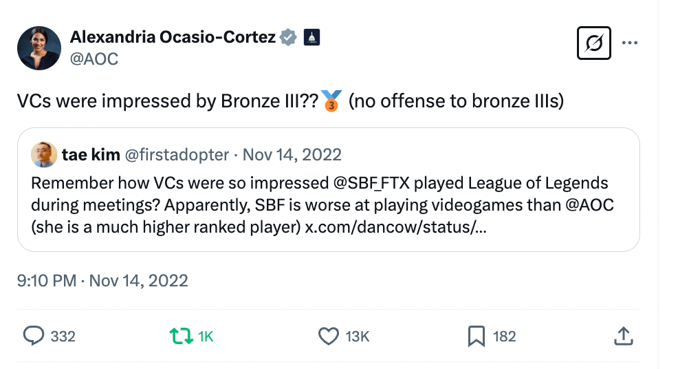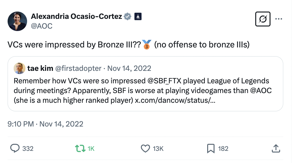 But even funnier was the narrative of how good SBF was at League of Legends – how he’d be playing during VC pitch meetings, and the magic was working so powerfully that this was taken as a strong vote of confidence.