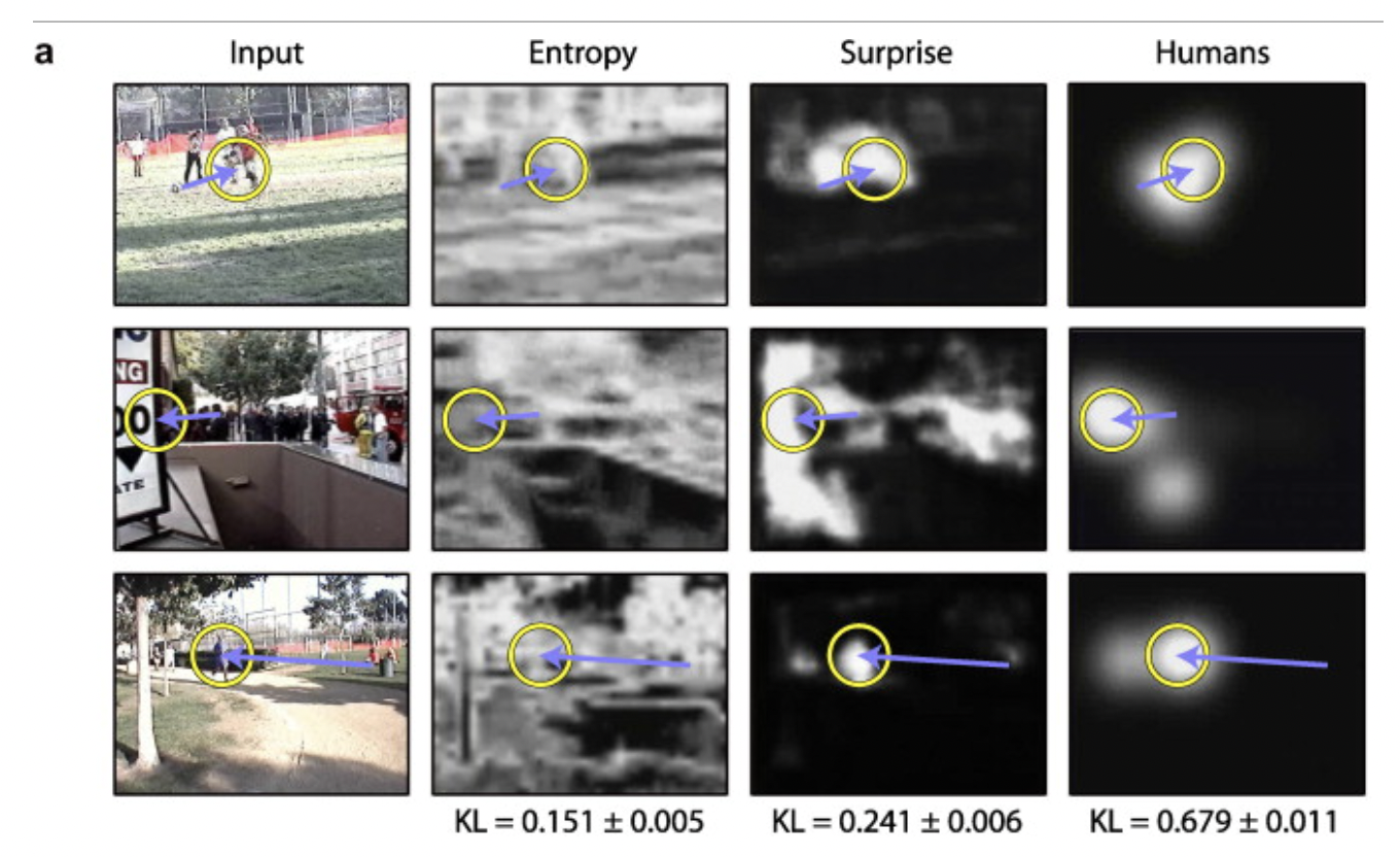As it turns out, our brains are optimized to care about surprise, and we can measure this scientifically. You can show someone a movie and calculate, for each pixel on the screen, how much uncertainty there is in each pixel over a time series. And you might think “our eyes are probably drawn to the pixels where there is uncertainty”, but that’s not what happens. Maximal uncertainty is actually like the “snow” pattern on an old TV – it’s not visually interesting. What our eyes are actually drawn towards is, guess what, KL Divergence. Our eyes follow the pixels that are surprising. Because that’s where the information is!