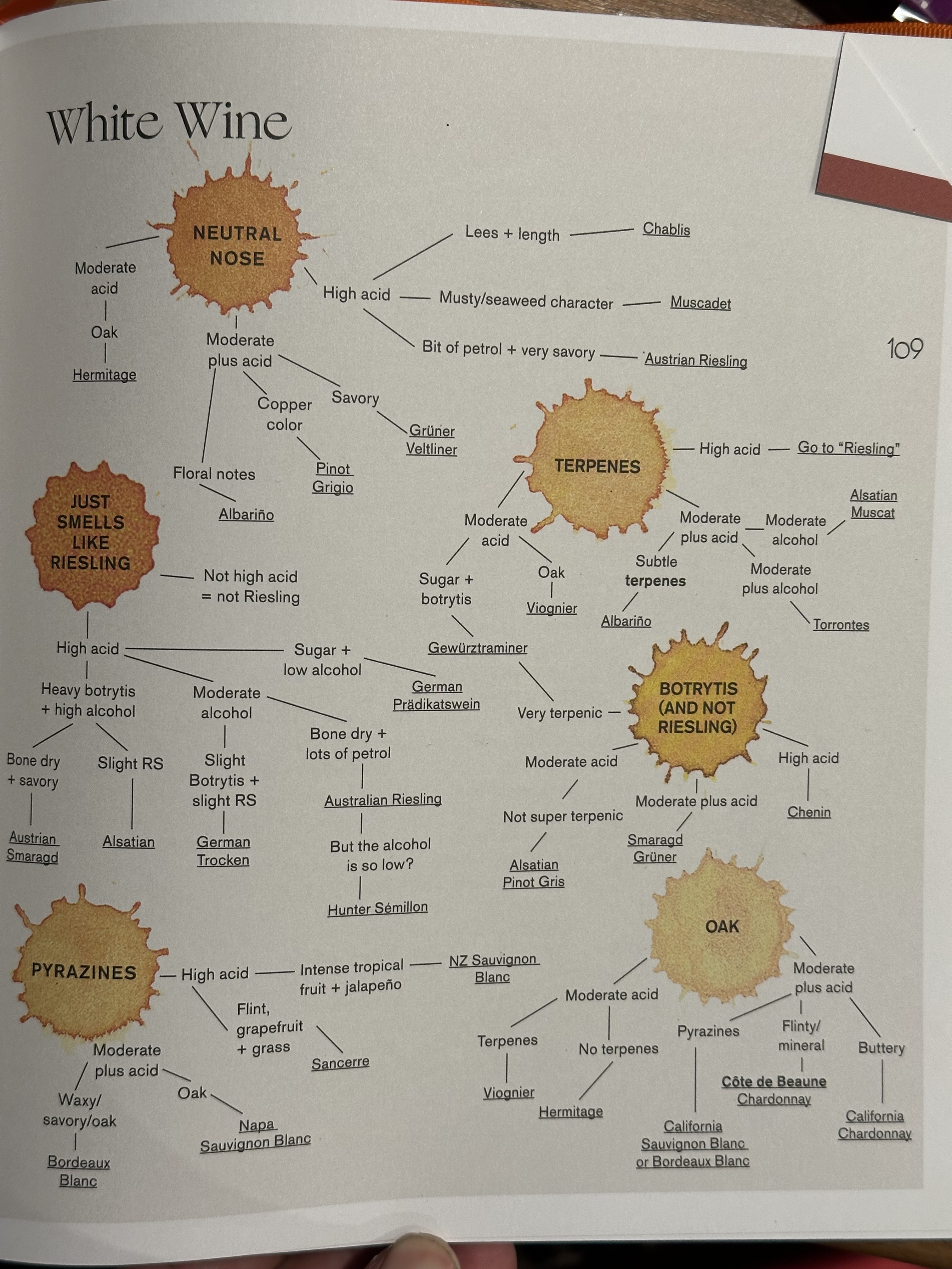-What does it smell like? Very perfume-y white wines (Viognier, Gewurtztraminer, Riesling) can be triaged from those that aren’t characteristically aromatic (Gruner, Chablis, White Hermitage) to get you in a narrower zone.