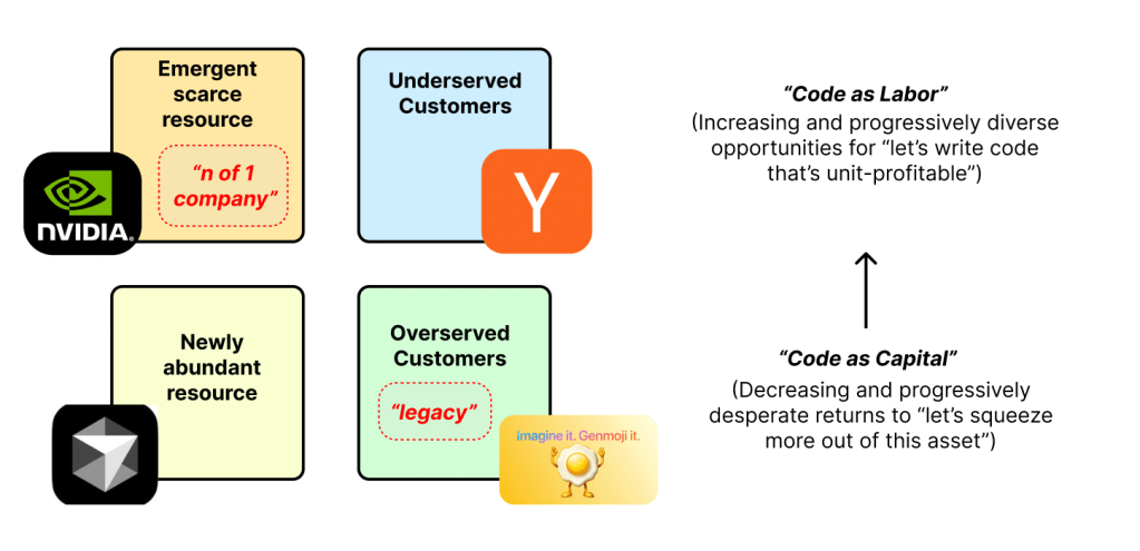 With that recap in place, we can pencil out the current state of software and AI-driven product roadmap development onto four quadrants: 1) the “Legacy” action that feels forced and tired, 2) the newly abundant resource that’s suddenly too cheap to meter, 3) the customers who can’t get enough of it, and 4) Nvidia.