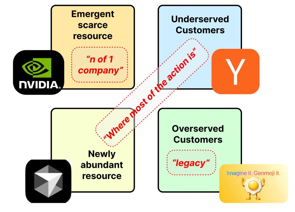- The interesting action lies in what people do with the newly abundant resource. It’s where the new behaviour is that really defines the era. For example, in a previous era of the web where Google was the n of 1 company, all of the interesting action was in Adwords and online advertising, where a new kind of “underserved customer” emerged with basically infinite demand to put the product do useful work, in markets like travel and ecommerce.