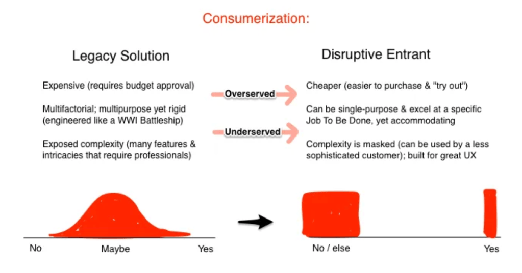 - The spark that ignites an adoption curve is when a technological unlock (“newly abundant resource”) suddenly offers end users a new kind of product, sometimes a single killer feature, which is “disruptive” in the sense that it focuses on a single, newly practical value proposition compared to incumbents and ignores the “legacy” checkboxes. The decision to use the product is a quick “Yes or No” decision, not a check box ordeal.
