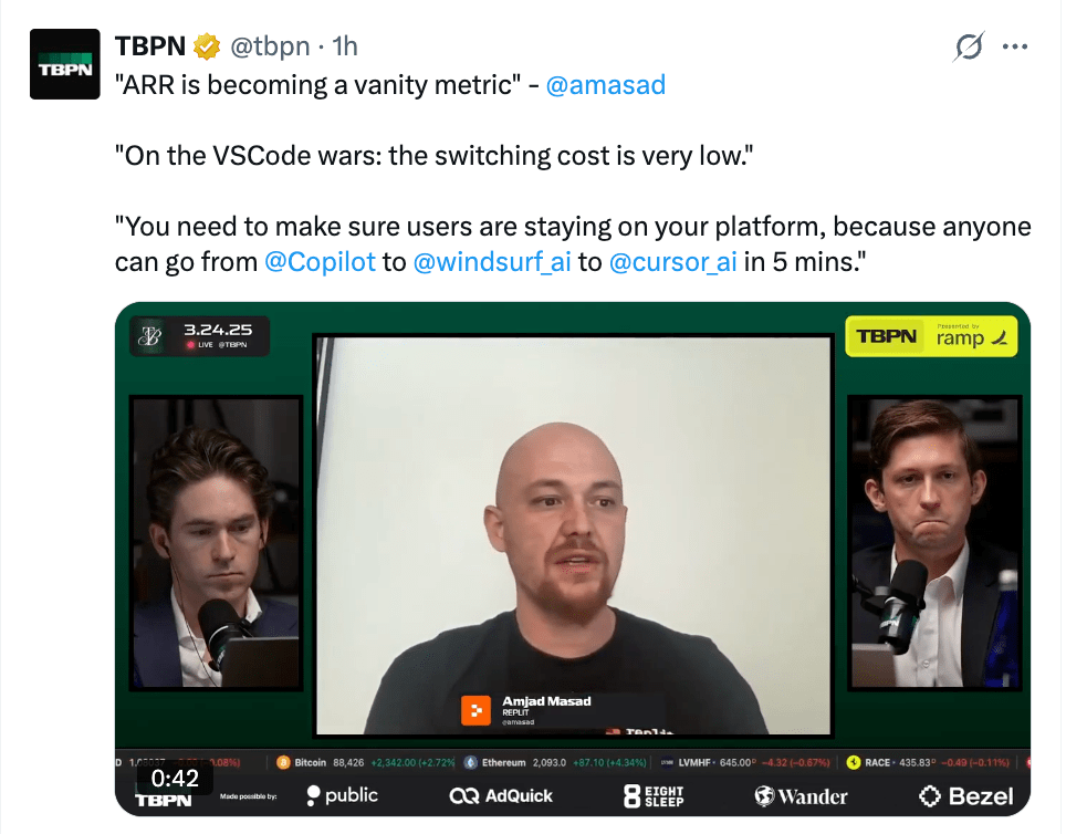 Amjad Masad of Replit, one of the shining stars of the Newly Abundant quadrant, shared on TBPN why even quick revenue is no guarantee of upward success anymore: the switching cost is so low between these different (and all excellent) products that practically all of the immense value being created is ending up as consumer surplus. Which is a great thing! Good luck picking winners on a valuation-adjusted basis, though.