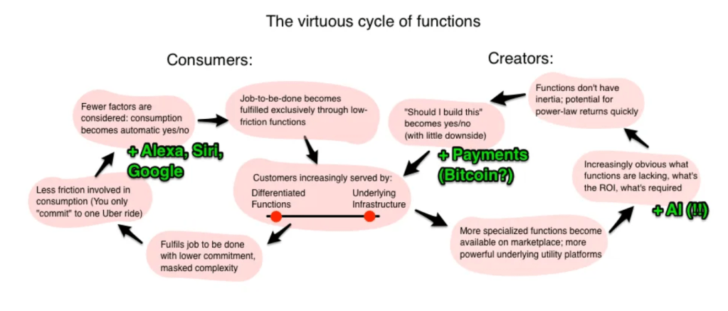 - A virtuous cycle kicks off where increasingly diverse, highly specified solutions both a) pull infrastructure forward, and b) make consumer choice even easier for product adoption (you can just try things, and it’s a yes/no decision as to whether you want to or not.)