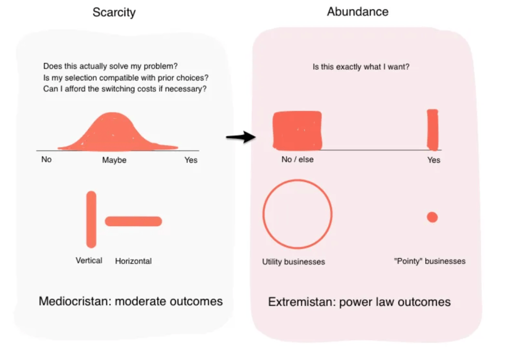 Those old Scarcity and Abundance posts were actually two different series I wrote at Social Capital, one in 2016 called “Emergent Layers” that iterated on The Innovator’s Dilemma, and a second in 2017 about positive feedback loops and Red Queen’s Races in environments of abundance. I think they hold up, 8 years later. They describe 2025 pretty darn well.